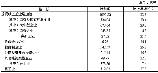 全年全部工業(yè)增加值1595.83億元,比上年增長(zhǎng)20.1%。規(guī)模以上工業(yè)增加值1090.82億元,增長(zhǎng)23.8%;產(chǎn)品銷售率96.2%;工業(yè)新產(chǎn)品產(chǎn)值377.21億元,增長(zhǎng)31.4%;工業(yè)品出口交貨值195.06億元,增長(zhǎng)34.8%。