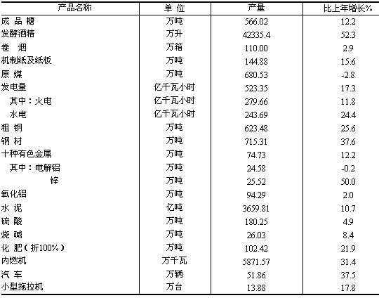 從主要行業(yè)看,黑色金屬冶煉及壓延加工業(yè)增加值105.14億元,增長(zhǎng)36.8%;電力、熱力生產(chǎn)和供應(yīng)業(yè)增加值133.57億元,增長(zhǎng)21.1%;交通運(yùn)輸設(shè)備制造業(yè)增加值90.00億元,增長(zhǎng)24.0%;有色金屬冶煉及壓延加工業(yè)增加值92.14億元,增長(zhǎng)25.1%;非金屬礦物制品業(yè)增加值58.05億元,增長(zhǎng)41.5%;化學(xué)原料及化學(xué)制品制造業(yè)增加值71.72億元,增長(zhǎng)34.6%;農(nóng)副食品加工業(yè)增加值157.43億元,增長(zhǎng)15.5%。 發(fā)電量523.35億千瓦小時(shí),比上年增長(zhǎng)17.3%;鋼材產(chǎn)量715.31萬(wàn)噸,增長(zhǎng)37.6%;內(nèi)燃機(jī)5871.57萬(wàn)千瓦,增長(zhǎng)31.4%;汽車產(chǎn)量51.86萬(wàn)輛,增長(zhǎng)37.5%;水泥產(chǎn)量3659.81萬(wàn)噸,增長(zhǎng)10.7%;成品糖產(chǎn)量566.02萬(wàn)噸,增長(zhǎng)12.2%。