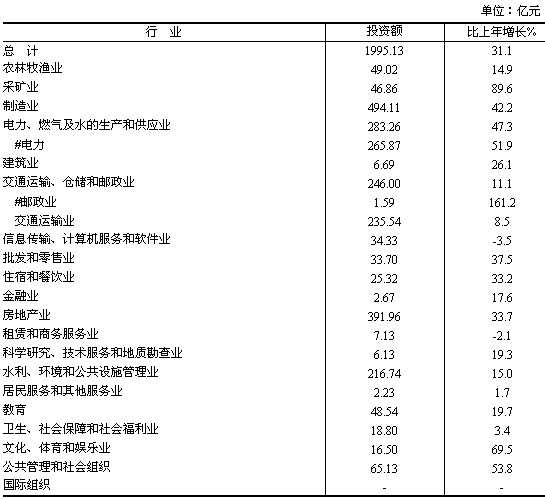 在城鎮(zhèn)固定資產(chǎn)投資中,從投資主體看,國(guó)有單位投資804.98億元,比上年增長(zhǎng)13.7%;非國(guó)有單位投資1190.15億元,增長(zhǎng)46.1%,其中民間投資1026.25億元,增長(zhǎng)50.4%。從產(chǎn)業(yè)看,第一產(chǎn)業(yè)投資49.02億元,增長(zhǎng)14.9%;第二產(chǎn)業(yè)投資830.92億元,增長(zhǎng)45.8%,其中工業(yè)投資824.23億元,增長(zhǎng)46.0%;第三產(chǎn)業(yè)投資1115.18億元,增長(zhǎng)22.6%。