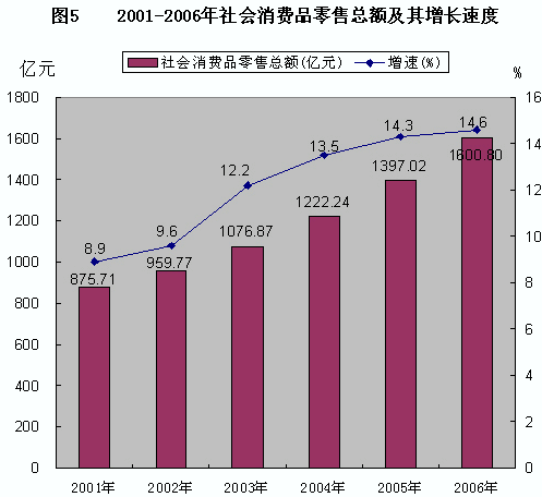 全年社會(huì)消費(fèi)品零售總額1600.8億元,比上年增長(zhǎng)14.6%。分城鄉(xiāng)看,城市消費(fèi)品零售額943.8億元,增長(zhǎng)15.2%;縣及縣以下消費(fèi)品零售額657.0億元,增長(zhǎng)13.8%。分經(jīng)濟(jì)類型看,國(guó)有經(jīng)濟(jì)實(shí)現(xiàn)零售額101.94億元,增長(zhǎng)10.2%;集體經(jīng)濟(jì)實(shí)現(xiàn)零售額54.74億元,增長(zhǎng)12.8%;私營(yíng)經(jīng)濟(jì)實(shí)現(xiàn)零售額158.68億元,增長(zhǎng)20.2%;個(gè)體經(jīng)濟(jì)實(shí)現(xiàn)零售額1019.54億元,增長(zhǎng)13.1%;聯(lián)營(yíng)經(jīng)濟(jì)實(shí)現(xiàn)零售額2.19億元,增長(zhǎng)40.5%;股份制經(jīng)濟(jì)實(shí)現(xiàn)零售額191.43億元,增長(zhǎng)19.3%;外商投資經(jīng)濟(jì)實(shí)現(xiàn)零售額14.13億元,增長(zhǎng)31.6%;港澳臺(tái)投資經(jīng)濟(jì)實(shí)現(xiàn)零售額2.91億元,增長(zhǎng)1.44倍;其他經(jīng)濟(jì)實(shí)現(xiàn)零售額55.28億元,增長(zhǎng)14.8%。分行業(yè)看,批發(fā)和零售業(yè)實(shí)現(xiàn)零售額1380.1億元,增長(zhǎng)14.6%;住宿和餐飲業(yè)實(shí)現(xiàn)零售額192.3億元,增長(zhǎng)16.1%。 從商品主要類別看,在限額以上批發(fā)零售貿(mào)易業(yè)中,石油及制品類零售額106.35億元,比上年增長(zhǎng)43.5%;通訊器材類零售額7.41億元,下降21.0%;家用電器和音像器材類零售額26.23億元,下降6.8%;汽車類零售額84.22億元,增長(zhǎng)17.2%;體育娛樂(lè)用品類增長(zhǎng)10.4%;文化辦公用品類下降14.4%;家具類增長(zhǎng)2.47倍;建筑及裝潢材料類增長(zhǎng)4.14倍。