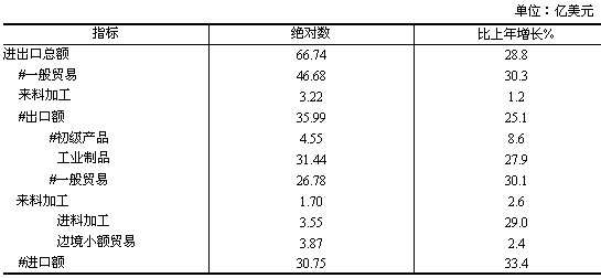 全年外貿(mào)進(jìn)出口總額 66.74億美元,增長(zhǎng)28.8%。其中,出口35.99億美元,增長(zhǎng)25.1%;進(jìn)口30.75億美元,增長(zhǎng)33.4