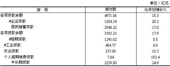 金融業(yè)增加值99.93億元,增長(zhǎng)14.4%。 年末全部金融機(jī)構(gòu)存款余額4971.86億元,比年初增長(zhǎng)18.3%;全部金融機(jī)構(gòu)貸款余額3595.25億元,比年初增長(zhǎng)17.9%。