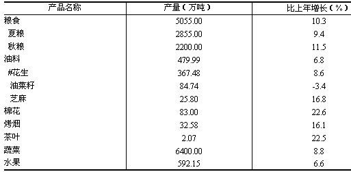 全年全省糧食種植面積13954.62萬(wàn)畝,比上年增加224.50萬(wàn)畝;其中,小麥種植面積7510.01萬(wàn)畝,增加66.00萬(wàn)畝,優(yōu)質(zhì)專用小麥種植面積占小麥種植面積的比重為61.4%。棉花種植面積1200.92萬(wàn)畝,增加28.71萬(wàn)畝。油料種植面積2326.50萬(wàn)畝,減少82.25萬(wàn)畝。蔬菜種植面積2597.70萬(wàn)畝,增加203.92萬(wàn)畝。 全年全省糧食產(chǎn)量5055.00萬(wàn)噸,比上年增產(chǎn)10.3%;棉花產(chǎn)量83.00萬(wàn)噸,增產(chǎn)22.6%;油料產(chǎn)量479.99萬(wàn)噸,增產(chǎn)6.8%。全年肉類總產(chǎn)量737.00萬(wàn)噸,增長(zhǎng)7.0%;禽蛋產(chǎn)量400.82萬(wàn)噸,增長(zhǎng)6.8%;牛奶產(chǎn)量147.68萬(wàn)噸,增長(zhǎng)42.0%。全年水產(chǎn)品產(chǎn)量60.10萬(wàn)噸,增長(zhǎng)16.3%。
