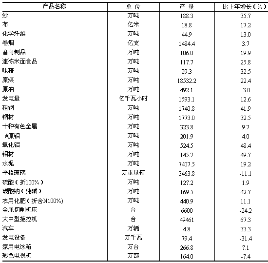 全省規(guī)模以上工業(yè)中,煤炭開(kāi)采和洗選業(yè)實(shí)現(xiàn)增加值380.71億元,比上年增長(zhǎng)20.6%;農(nóng)副食品加工業(yè)增加值270.72億元,增長(zhǎng)25.1%;紡織業(yè)增加值147.31億元,增長(zhǎng)21.3%;化學(xué)原料及化學(xué)制品制造業(yè)增加值230.08億元,增長(zhǎng)26.8%;非金屬礦物制品業(yè)增加值391.45億元,增長(zhǎng)26.9%;黑色金屬冶煉及壓延加工業(yè)增加值242.08億元,增長(zhǎng)24.7%;有色金屬冶煉及壓延加工業(yè)增加值298.88億元,增長(zhǎng)18.2%;通用設(shè)備制造業(yè)增加值150.78億元,增長(zhǎng)27.9%;專用設(shè)備制造業(yè)增加值132.27億元,增長(zhǎng)23.0%;電力、熱力的生產(chǎn)和供應(yīng)業(yè)增加值368.11億元,增長(zhǎng)21.4%。 主要工業(yè)產(chǎn)品產(chǎn)量中,畜肉制品產(chǎn)量比上年增長(zhǎng)19.9%,速凍米面食品增長(zhǎng)25.8%,原煤增長(zhǎng)22.4%,發(fā)電量增長(zhǎng)12.6%,鋼材增長(zhǎng)32.5%,鋁材增長(zhǎng)49.7%,大中型拖拉機(jī)增長(zhǎng)67.3%。