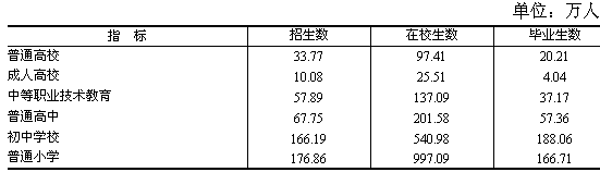 全年全省普通高等學(xué)校招生33.77萬(wàn)人,在校生97.41萬(wàn)人,畢業(yè)生20.21萬(wàn)人。普通高中招生67.75萬(wàn)人,在校生201.58萬(wàn)人,畢業(yè)生57.36萬(wàn)人。初中學(xué)校招生166.19萬(wàn)人,在校生540.98萬(wàn)人,畢業(yè)生188.06萬(wàn)人。普通小學(xué)招生176.86萬(wàn)人,在校生997.09萬(wàn)人,畢業(yè)生166.71萬(wàn)人。