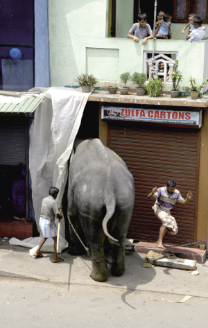 7月30日,在斯里蘭卡首都科倫坡的一個(gè)節(jié)日慶典上,看象人正試圖阻止一頭想要“入侵”建筑物的大象。這頭15歲的大象在節(jié)日慶典上突然“情緒失控”,毀壞了兩輛三輪出租車,并一度造成交通堵塞。