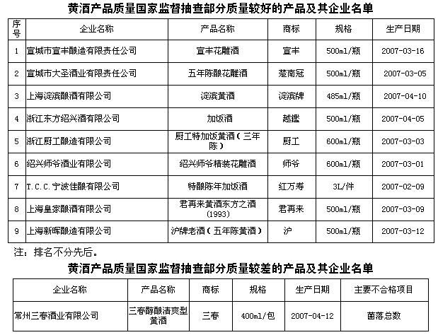 此次抽查依據(jù)GB2758-2005《發(fā)酵酒衛(wèi)生標(biāo)準(zhǔn)》等強(qiáng)制性國家標(biāo)準(zhǔn)及相應(yīng)產(chǎn)品的標(biāo)準(zhǔn),對(duì)黃酒產(chǎn)品的感官、非糖固形物、酒精度、總酸、氨基酸態(tài)氮、苯甲酸、山梨酸、糖精鈉、甜蜜素、鉛、菌落總數(shù)、大腸菌群、沙門氏菌、志賀氏菌、金黃色葡萄球菌以及標(biāo)簽等16個(gè)項(xiàng)目進(jìn)行了檢驗(yàn)。
