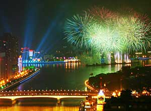 2007年春節(jié),廣州珠江白鵝潭江面舉行煙花會(huì)演。攝影/本報(bào)記者