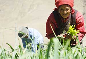 | 西藏山南地區(qū)乃東縣的農(nóng)民喜收蒜苔,當(dāng)?shù)卣M(jìn)行農(nóng)業(yè)結(jié)構(gòu)調(diào)整取得明顯成果。 | 在湍急水流的沖擊下,西藏白朗縣貴熱村的廠房里的四臺(tái)水磨發(fā)出了隆隆的轟鳴聲,旋舞的磨盤下,細(xì)密的糌粑向雪花一樣落入收集槽里。已經(jīng)在這個(gè)名為康桑農(nóng)產(chǎn)品加工廠里工作兩年多的達(dá)娃頓珠說:“一個(gè)磨盤一天一夜可以磨一千斤糌粑,產(chǎn)品銷路非常好,除了拉薩、日喀則,還賣到了尼泊爾! 眼下,像康桑這樣的特色農(nóng)產(chǎn)品加工企業(yè)正在西藏不少地區(qū)蓬勃興起,成為當(dāng)?shù)剞r(nóng)村、農(nóng)業(yè)經(jīng)濟(jì)增長的新亮點(diǎn)。西藏自治區(qū)人大常委會(huì)副主任洛桑頓珠說,充分利用生態(tài)條件,將環(huán)保和經(jīng)濟(jì)發(fā)展相結(jié)合,是雪域高原特色農(nóng)業(yè)發(fā)展的必經(jīng)之路。