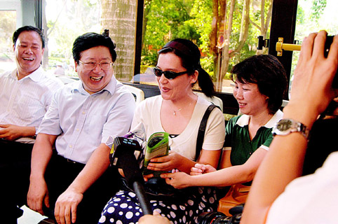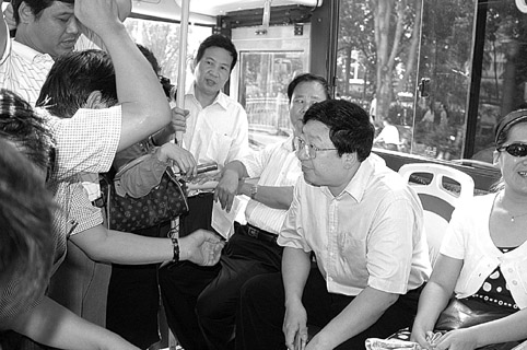 昨日上午9時35分,來自武鳴的鄧永玉抱著一歲半的孩子在民族大道登上一輛211路公交車。在道了一聲“謝謝”后,她自然地坐在了一名中年人主動讓出來的位置上——經(jīng)常帶孩子出門,經(jīng)常乘公交車,也經(jīng)常得到別人讓座的“禮遇”,鄧永玉已經(jīng)“習(xí)慣成自然”。 但鄧永玉怎么也想不到,這次給自己讓座的人竟是市長陳向群。在南寧市首屆“城市公共交通周及無車日”活動的第一天,陳市長搭上一輛211路公交車返回市政府,實實在在地當了一回“公交一族”,不僅用實際行動倡導(dǎo)“無車日”,還留下了一車佳話。 上午9時25分左右,“無車日”活動儀式啟動后,陳市長便來到民族廣場公交站臺等車,準備搭211路公交車回市政府。“目前公交車上的小偷多不多?坐公交車方不方便?”在站臺上,陳市長向候車的市民了解情況,同時勸導(dǎo)市民站到站臺上,不要把公交車的路給堵了。 9時29分,一輛211路公交車駛進站臺。此時,車上已有不少乘客。陳市長與其他乘客一起上了車。為了不驚動司機與其他乘客,陳向群與普通乘客一樣,主動投幣后就悄悄選擇一個靠近前門的空位坐了下來。很快,車上已擠滿了一車人。 9時35分,211路公交車靠站停車,來自武鳴縣城的鄧永玉抱著一個一歲半的小孩子上公交車后,享受到了“特殊”的待遇:市長讓座。從交談中,得知給自己讓座的是市長后,她激動地說:“我真想不到,給我讓座的會是市長!這個"綠色出行"活動真是好啊,不僅方便我們乘客出行,也可以讓我們和市領(lǐng)導(dǎo)同坐一輛公交車,體會到領(lǐng)導(dǎo)對我們老百姓的體恤和關(guān)心! 同時,陳市長身邊的工作人員也把空位讓給了一名剛上車的小伙子。小伙子叫廖宇,他顯得有些不好意思:“長這么大,還是頭一次與市長同乘一輛公交車,覺得很榮幸,也很感動。” 一路上,陳市長與同車的乘客們聊起了南寧交通狀況。在寶資通公司工作的廖宇告訴市長,他的煩惱是每次坐公交車都擁擠,有時累得滿頭大汗,上下班時就更擠了。陳市長說,今后,市政府將堅持優(yōu)先發(fā)展城市公交戰(zhàn)略,從資金、土地、政策等方面大力扶持公共交通發(fā)展,改善公交服務(wù)設(shè)施和服務(wù)環(huán)境,為廣大市民創(chuàng)建環(huán)保、健康、安全、暢通的公交出行環(huán)境。 9時50分,211路公交車開到市政府站。一位80多歲的阿婆下車不方便,陳市長忙上前,小心地攙著老人一步步走下公交車!皠e急,我扶您,慢慢下車!标愂虚L輕聲對老太太說。等到老人站穩(wěn)后,陳市長才輕輕地把手放開。
