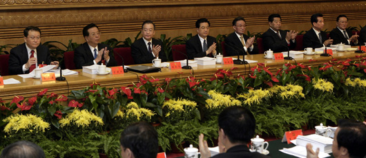 | 10月17日,中國共產(chǎn)黨第十七次全國代表大會(huì)主席團(tuán)在北京人民大會(huì)堂舉行第二次會(huì)議。胡錦濤、吳邦國、溫家寶、賈慶林、曾慶紅、吳官正、李長春、羅干等出席會(huì)議。 |