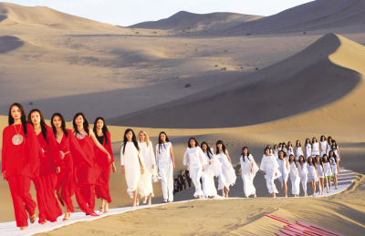 某著名服裝品牌2008春夏時(shí)裝發(fā)布會(huì)近日在甘肅敦煌鳴沙山舉行,模特們?cè)谏城鹕洗罱ǖ腡型臺(tái)上展示近200款新款時(shí)裝,上演驚艷的“沙丘秀”。