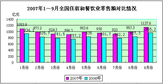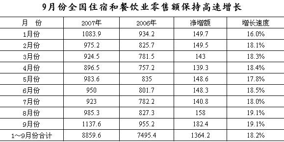 今年前三季度,我國住宿和餐飲行業(yè)實現(xiàn)較好較快發(fā)展,餐飲消費(fèi)再創(chuàng)佳績。據(jù)有關(guān)數(shù)據(jù)分析,1-9月份全國住宿與餐飲業(yè)零售額累計8859.6億元,同比凈增1364.2億元,增長18.2%,增幅比去年同期高出3.3個百分點(diǎn),比社會消費(fèi)品零售總額增長高出2.3個百分點(diǎn),占社會消費(fèi)品零售總額的比重為13.9%,對社會消費(fèi)品零售總額的增長貢獻(xiàn)率為15.6%。 從限額分類看,1-9月份,限額以上住宿與餐飲企業(yè)增速領(lǐng)先,零售額占全國住宿與餐飲業(yè)零售額的29.7%,同比增長18.9%,高于同期全國住宿與餐飲業(yè)零售額增幅0.7個百分點(diǎn),拉動全國住宿與餐飲業(yè)零售額增長5.6個百分點(diǎn)。限額以下住宿與餐飲企業(yè)穩(wěn)中有升,零售額占全國住宿與餐飲業(yè)零售額的70.3%,同比增長17.9%,低于同期全國住宿與餐飲業(yè)零售額增幅0.3個百分點(diǎn),拉動全國住宿與餐飲業(yè)零售額增長12.6個百分點(diǎn)。 利用外資增速趨緩。1-9月份,住宿與餐飲業(yè)新設(shè)立外商投資企業(yè)數(shù)量進(jìn)一步減少,為683家,同比下降15.1%;合同外資金額24.23億美元,同比增長13.6%;實際使用外資金額6億美元,同比增長8.6%,但增幅比去年同期有所減緩。 隨著全國餐飲消費(fèi)安全專項整治活動的深入開展,住宿和餐飲市場將進(jìn)一步規(guī)范,食品安全進(jìn)一步加強(qiáng),服務(wù)質(zhì)量進(jìn)一步提升,預(yù)測第四季度大眾化餐飲消費(fèi)將繼續(xù)擴(kuò)大,集團(tuán)餐飲消費(fèi)將更加集中,預(yù)計全年住宿和餐飲業(yè)零售額將達(dá)到12270億元,同比增長18.6%。
