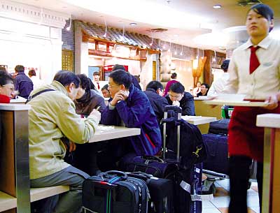 近日,首都機(jī)場(chǎng)航站樓內(nèi)部分餐飲店開(kāi)始降價(jià),單品最高降價(jià)達(dá)33%。預(yù)計(jì)到11月30日,共248種食品將和市內(nèi)同質(zhì)同價(jià)。圖為機(jī)場(chǎng)航站樓地下一層中華美食城餐廳一角。