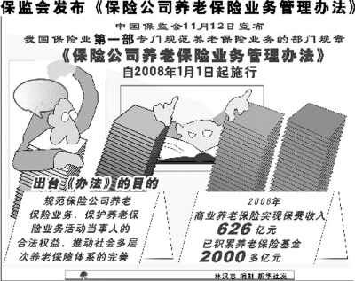 如何使咱們退休后生活水平不下降?買點(diǎn)商業(yè)養(yǎng)老保險(xiǎn),是很好的選擇之一。然而,目前商業(yè)養(yǎng)老保險(xiǎn)還處于發(fā)展的初級階段,存在著整體規(guī)模小、專業(yè)化程度低、外部經(jīng)營環(huán)境還有待改善等問題。為解決這些問題,保監(jiān)會(huì)日前發(fā)布了《保險(xiǎn)公司養(yǎng)老保險(xiǎn)業(yè)務(wù)管理辦法》(下稱《辦法》),該《辦法》將于2008年1月1日起實(shí)施。