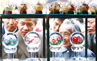 12月1日,“盛世觀前”首屆中國民間手工藝藝術(shù)節(jié)在蘇州市觀前街玄妙廣場拉開帷幕。來自國內(nèi)10多個(gè)省市的民間藝人在藝術(shù)節(jié)上展示絕活。 圖為參觀者在一個(gè)來自河北省安平縣的水晶內(nèi)畫工藝攤點(diǎn)前觀賞作品。