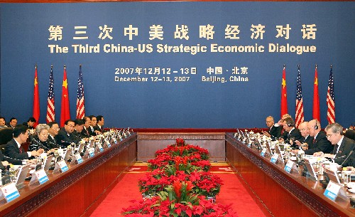 12月12日,第三次中美戰(zhàn)略經(jīng)濟(jì)對話在北京開幕。中國國務(wù)院副總理吳儀和美國財政部部長保爾森作為兩國元首特別代表共同主持對話。新華社記者 高潔