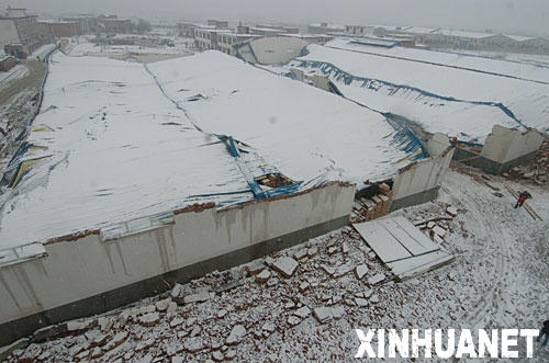 1月19日,合肥市瑤海工業(yè)園區(qū)內(nèi)四千多平方米的倉(cāng)庫(kù)頂棚被積雪壓塌。新華社發(fā)