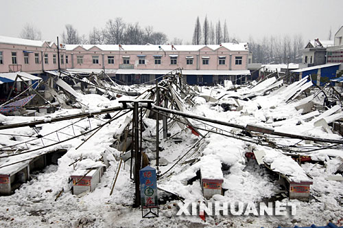 這是因大雪整體坍塌的安徽省舒城縣城關(guān)鎮(zhèn)孔集農(nóng)貿(mào)市場(chǎng)(1月22日攝)。 |