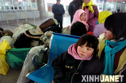 1月20日,一名小女孩與家長在汽車站內(nèi)等待班車開通的信息。