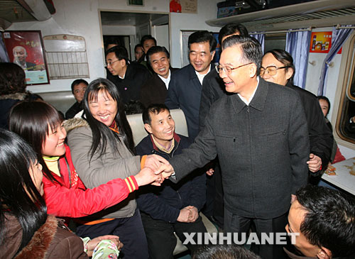 1月30日,中共中央政治局常委、國務(wù)院總理溫家寶在廣州火車站看望旅客。這是溫家寶總理登上一列即將發(fā)往南昌的火車與旅客交談。