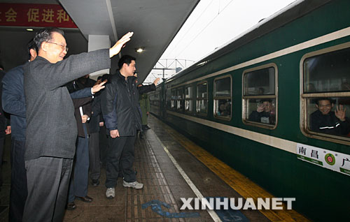 這是溫家寶總理在站臺上為一列發(fā)往南昌的旅客列車送行。