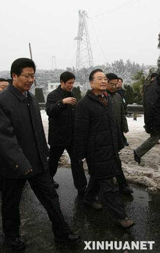 1月29日,中共中央政治局常委、國務院總理溫家寶在湖南湘潭市郊外查看電力設施受損情況。