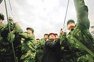2月16日,支援江西贛州定南線路搶修的南京軍區(qū)某部官兵,得知當(dāng)?shù)刈罾щy的高沙塘、上蔡兩個村民小組尚未恢復(fù)通電的消息,主動請戰(zhàn)開赴現(xiàn)場,通過兩天的艱苦奮戰(zhàn),定南農(nóng)村電網(wǎng)全面恢復(fù)供電。圖為官兵們在高沙塘拉線。熊義詔/攝 |