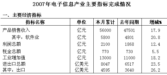 2007年,電子信息全行業(yè)在黨中央、國務(wù)院的正確領(lǐng)導(dǎo)下,堅持以科學(xué)發(fā)展觀為指導(dǎo),認真貫徹落實國家戰(zhàn)略部署和宏觀調(diào)控措施,積極應(yīng)對技術(shù)業(yè)務(wù)轉(zhuǎn)型升級和宏觀政策環(huán)境變化的新形勢,不斷推動結(jié)構(gòu)調(diào)整和自主創(chuàng)新,積極拓展國內(nèi)外市場,使產(chǎn)業(yè)經(jīng)濟運行呈現(xiàn)平穩(wěn)發(fā)展態(tài)勢,為國民經(jīng)濟和社會發(fā)展做出了新的貢獻。