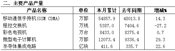 。ㄒ唬┊a(chǎn)業(yè)規(guī)模不斷擴大 全年實現(xiàn)銷售收入5.6萬億元,增長18%;增加值13000億元,增長18.2%;軟件業(yè)務(wù)收入5800億元,增長20.8%。產(chǎn)業(yè)規(guī)模繼續(xù)在國民經(jīng)濟各行業(yè)中位居領(lǐng)先,銷售收入占全國工業(yè)的比重為12%,增加值占全國GDP的比重達5.27%。 。ǘ┙(jīng)濟效益穩(wěn)步提高 進入二季度后,全行業(yè)經(jīng)濟效益開始扭轉(zhuǎn)負增長的局面,至12月底實現(xiàn)利稅2870億元。其中實現(xiàn)利潤2100億元,增長12.4%;稅收770億元,增長5.5%;二者增速比上半年提高2個百分點以上。計算機、家用視聽設(shè)備和電子器件行業(yè)效益情況較好,利潤增速達20%以上,成為拉動全行業(yè)效益增長的主要力量。 。ㄈ┊a(chǎn)品產(chǎn)銷銜接良好 多數(shù)重點產(chǎn)品產(chǎn)量保持平穩(wěn)增長,全年生產(chǎn)手機5.48億部,增長14%;微型計算機1.21億臺,增長29%;數(shù)碼相機7493.5萬臺,增長11.9%;集成電路產(chǎn)量412億塊,增長22.6%;彩色電視機8433萬臺,增長0.7%。產(chǎn)品產(chǎn)銷銜接良好,手機、計算機、彩電等主要產(chǎn)品產(chǎn)銷率均達98%以上。全行業(yè)產(chǎn)品庫存慢于收入增長,增速為17%,比收入增速低了1個百分點。 。ㄋ模⿲ν赓Q(mào)易增勢平穩(wěn) 全行業(yè)對外貿(mào)易額達到8047億美元,同比增長23.5%,占全國外貿(mào)總額的37%。出口4595億美元,增長26.2%,增速比全國出口高了0.5個百分點,占全國出口總額的比重為37.7%。進口3452億美元,增長20%,占全國進口總額的比重為36.1%。出口較快的主要是計算機和電子元件行業(yè),二者增速分別比全行業(yè)高了2.8和10.8個百分點。 。ㄎ澹┕潭ㄙY產(chǎn)投資繼續(xù)擴大 全行業(yè)500萬元以上投資項目累計完成投資2646億元,同比增長27.9%;本年新增固定資產(chǎn)1477億元,增長9.2%。本年新開工項目2780個,同比增長10.2%;新開工項目的計劃投資總額為2303億元,增長34.9%;新開工項目主要來自電子元器件領(lǐng)域,二者新開工項目超過1300項,占全行業(yè)的一半左右。 (六)企業(yè)實力不斷增強 全行業(yè)規(guī)模以上企業(yè)共有27569家,其中制造業(yè)14601家,軟件業(yè)12968家。企業(yè)經(jīng)濟規(guī)模不斷擴大,全年電子信息百強企業(yè)完成營業(yè)收入超過1萬億元,實現(xiàn)利稅超過500億元,出口交貨值增長20%以上,日益成為推動行業(yè)平穩(wěn)運行的中堅力量。 。ㄆ撸┛萍紕(chuàng)新日趨深入 新品開發(fā)穩(wěn)步增長,全行業(yè)新品產(chǎn)值率超過20%,比上年提高了0.2個百分點。企業(yè)研發(fā)投入不斷提高,全行業(yè)研發(fā)投入超過1000億元,電子信息百強企業(yè)研發(fā)投入占銷售收入比重接近4%,其中有11家企業(yè)比例已超過6%,海爾、華為等研發(fā)投入均超過50億元。 。ò耍﹨^(qū)域布局日益集中 九個國家信息產(chǎn)業(yè)基地實現(xiàn)收入超過3萬億元,成為引領(lǐng)產(chǎn)業(yè)增長的重要地區(qū),并在結(jié)構(gòu)調(diào)整、技術(shù)創(chuàng)新、產(chǎn)業(yè)配套、外貿(mào)出口、人才就業(yè)等方面發(fā)揮重要的帶動示范效應(yīng)。40個國家電子信息產(chǎn)業(yè)園,分別在通信、計算機、家電、集成電路、電子元件、電子器件、電子材料等專業(yè)領(lǐng)域處于全國領(lǐng)先地位,合計產(chǎn)業(yè)規(guī)模占全國的1/4以上。 (九)能源消耗處于較低水平 全年規(guī)模以上制造業(yè)消耗標準煤1476萬噸,每萬元增加值消耗標準煤0.164噸,比上年下降1.2%,約等于國民經(jīng)濟和工業(yè)平均水平的15%和7%。其中能耗排在前面的小行業(yè)分別是電子真空器件(1.13噸)、電光源(0.61噸)、印制電路板(0.38噸)、信息化學(xué)材料(0.37噸)、光纖光纜(0.36噸)。從能源產(chǎn)品看,電力、原煤、燃料油、柴油占據(jù)前四位,分別占全行業(yè)能源消耗量的49%、15%、11%、10%。 。ㄊ┬畔⒒潭冗M一步提高 全國手機普及率達到41.6%,比上年增加了6.3個百分點;互聯(lián)網(wǎng)用戶達到2.1億人,比上年增長7000萬人以上;城鎮(zhèn)居民計算機擁有量達到59.7臺/百戶,彩電擁有量超過151臺/百戶,二者分別比上年提高了15%和5%。國家信息化投資占城市基礎(chǔ)設(shè)施投資的比重接近10%,電子政務(wù)投入在電信建設(shè)投入的比重為12%。企業(yè)電子商務(wù)不斷推進,電子大中型企業(yè)電子商務(wù)采購、銷售額占營業(yè)額的比重達40%。 (十一)從業(yè)人數(shù)不斷增加 全年規(guī)模以上電子信息產(chǎn)業(yè)就業(yè)人數(shù)達到777萬人,其中制造業(yè)675萬人,軟件業(yè)102萬人;二者合計比上年增加了53萬人,占全國城鎮(zhèn)新增就業(yè)人數(shù)的5%,其中制造業(yè)新增就業(yè)人數(shù)占全國工業(yè)的比重為10%。 。ㄊ┊a(chǎn)品價格呈下降趨勢 2007年,我國主要消費類電子產(chǎn)品價格指數(shù)為85.2,降幅較上年增加了0.7個百分點,比全國CPI低19.6個百分點。其中微型計算機價格指數(shù)為85,筆記本價格指數(shù)80,液晶電視機價格指數(shù)78,CRT電視機價格指數(shù)為95,手機價格指數(shù)85,數(shù)碼相機80,激光視盤機價格指數(shù)96.5,音響價格指數(shù)98.5。電子信息產(chǎn)品價格下降平抑了物價上漲的趨勢,推動居民消費價格漲幅下降0.53個百分點。