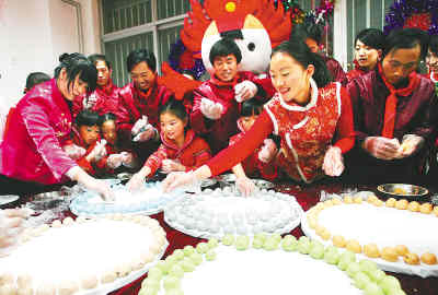 師生們?yōu)楣と藥煾当硌萘司实墓?jié)目,還和工人們一起賞花燈、猜燈謎,一起動(dòng)手包出象征奧運(yùn)五環(huán)的五彩湯圓,共同祝福北京奧運(yùn),陶醉在喜慶祥和的節(jié)日氣氛中。