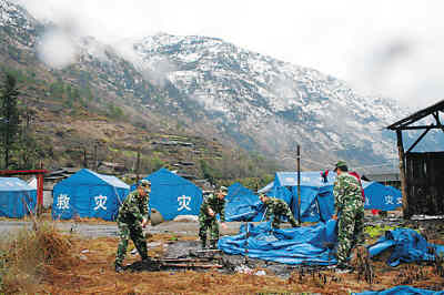 云南省怒江傈僳族自治州近日遭遇嚴(yán)重雪災(zāi)。云南邊防總隊(duì)派出由1600余名官兵組成的搶險(xiǎn)救災(zāi)突擊隊(duì),參加搶險(xiǎn)救災(zāi)。圖為官兵為災(zāi)民搭建帳篷。