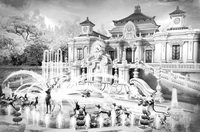 | 橫店圓明新園效果圖(西洋樓—大水法) | 公元1860年,大火在焚燒了整整3天后,享有“萬園之園”美譽(yù)的清代皇家園林——圓明園,被燒得面目全非,只剩下了殘?jiān)珨啾凇?BR> 此后的百余年間,是否要重建圓明園的爭論卻一直沒有停止過。無論是主張修復(fù)的“主修派”,還是主張維持原狀的“保留派”,都舉步維艱。無可否認(rèn)的是,這片廢墟承載了太多的沉重記憶,列強(qiáng)侵略中國的歷史在這里鐫刻。 2006年初,以經(jīng)營影視基地而聞名的浙江橫店集團(tuán)宣布將籌建圓明新園。建筑界、學(xué)術(shù)界一片嘩然,眾多網(wǎng)民也紛紛發(fā)表自己的觀點(diǎn)。2008年2