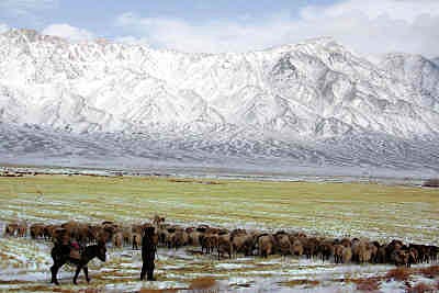 圖為牧民在雪地里牧羊。