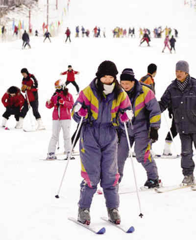 | 正在學(xué)習(xí)滑雪的南方游客 | 當(dāng)滑雪從歐美傳入中國后,誰也不曾想到,這項西方的“貴族運動”會在近幾年,在中國迅速走向大眾。幾年突飛猛進地發(fā)展,使滑雪運動不再高高在上。在一些滑雪場可以看到,當(dāng)?shù)氐氐氐赖赖霓r(nóng)民擔(dān)當(dāng)著導(dǎo)滑員,操練著城里人,發(fā)燒友不再只是那些