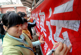 圖為志愿者與沈陽市四平街社區(qū)居民一起在“微笑迎接奧運(yùn)”條幅上簽名。