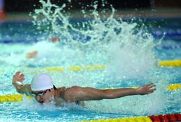 2008年全國游泳冠軍賽暨奧運(yùn)選拔賽上,吳鵬在男子100米蝶泳預(yù)賽中。新華社記者:徐昱