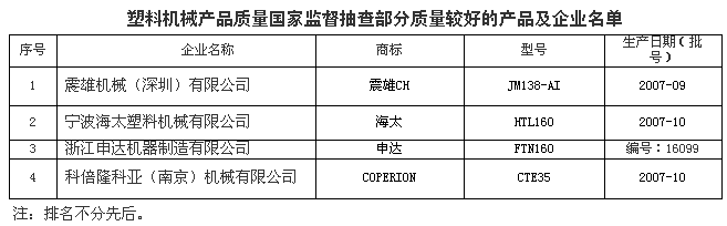 為維護消費者的合法權(quán)益,促進塑料機械行業(yè)健康發(fā)展,國家質(zhì)檢總局組織對塑料機械產(chǎn)品質(zhì)量進行了國家監(jiān)督抽查。共抽查了上海、浙江、江蘇、廣東、福建、山東等6個省、直轄市30家企業(yè)生產(chǎn)的30種產(chǎn)品(不涉及出口產(chǎn)品),產(chǎn)品實物質(zhì)量抽樣合格率為90%。