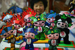4月7日,北京市懷柔區(qū)的一名退休教師郭秀芳展示她親手制作的福娃。郭秀芳在業(yè)余時間用布料縫制了百余件北京奧運會吉祥物福娃,送給社區(qū)居民,并在社區(qū)活動中展示。