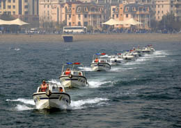 4月13日,特警隊員駕駛高速摩托艇在青島奧帆中心海域演練海上編隊課目。新華社記者:朱崢 攝