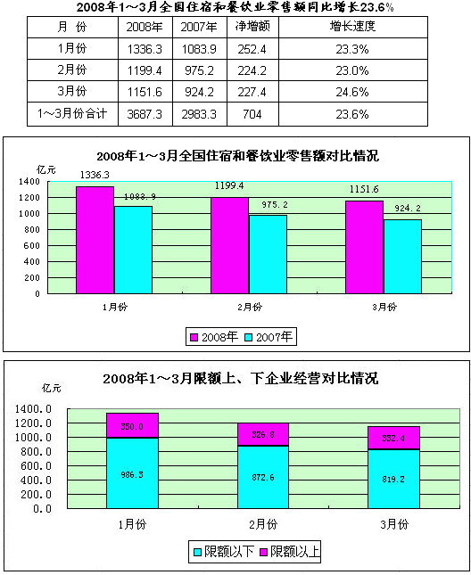 商務(wù)部商業(yè)改革司根據(jù)有關(guān)數(shù)據(jù)分析,今年一季度,全國(guó)住宿與餐飲市場(chǎng)延續(xù)去年四季度的走勢(shì),繼續(xù)保持20%以上的高增長(zhǎng),零售額達(dá)到3687.3億元,同比增長(zhǎng)23.6%,比去年同期增幅高出6.2個(gè)百分點(diǎn),占社會(huì)消費(fèi)品零售總額的比重為14.4%,拉動(dòng)社會(huì)消費(fèi)品零售總額增長(zhǎng)3.3個(gè)百分點(diǎn),對(duì)社會(huì)消費(fèi)品零售總額的增長(zhǎng)貢獻(xiàn)率為16.1%。