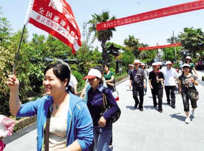 杭州灣跨海大橋于5月1日23時(shí)58分試運(yùn)營通車.杭州灣跨海大橋的開通,給大橋周邊的人們帶來了致富機(jī)遇。圖為一些游客通過杭州灣跨海大橋抵達(dá)寧波一個(gè)生態(tài)農(nóng)莊旅游觀光。