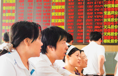 圖為5月5日,?谝患易C券營(yíng)業(yè)部里股民正在看盤。