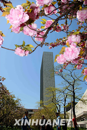 這是5月5日在櫻花掩映下的聯(lián)合國總部大廈。