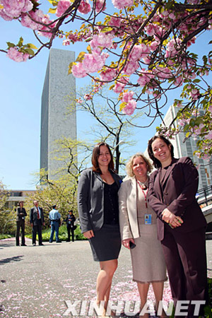 5月5日,三位女士在聯(lián)合國總部花園的櫻花樹下留影。