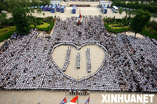 全院師生圍成一個(gè)大大的“心”形,中間是一個(gè)“川”字,師生們通過這樣的方式向?yàn)?zāi)區(qū)的人民表達(dá)一種信念,不管是“四川”“汶川”“北川”,還是凝結(jié)在人們眉間的“川”字,全國(guó)人民都永遠(yuǎn)心系災(zāi)區(qū)。