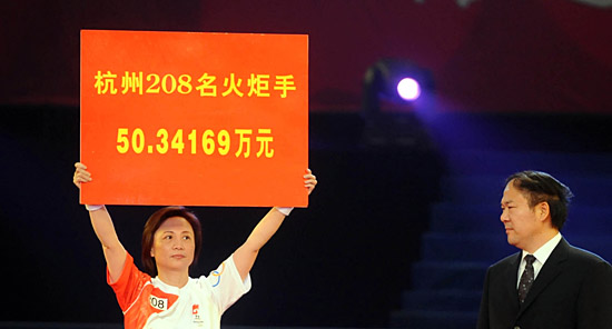 | 在杭州黃龍體育館,吳小璇代表杭州所有火炬手為災(zāi)區(qū)捐款,她也成為圣火暫停傳遞前的最后一棒火炬手。新華社記者 徐昱