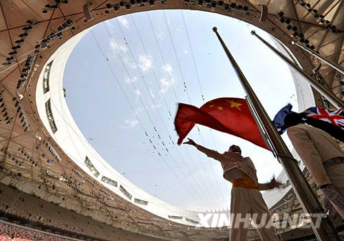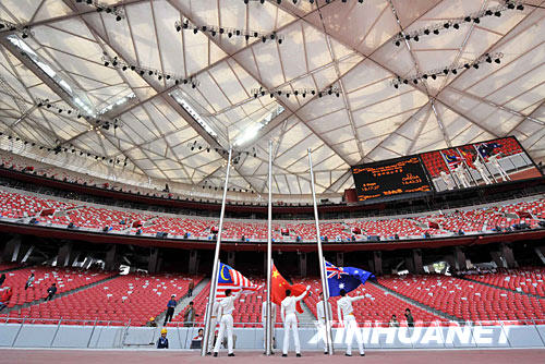圖為旗手們在“鳥巢”內進行升旗演練(5月18日攝)。