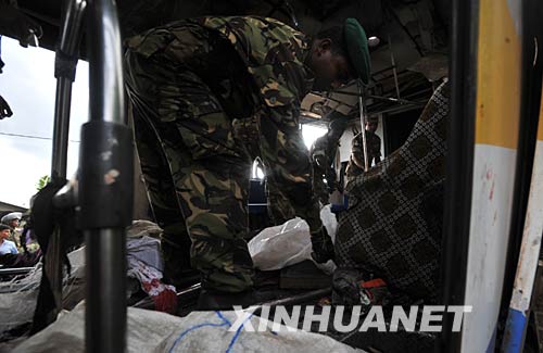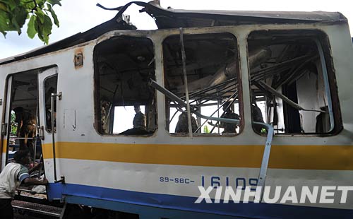 5月26日下午,一列客運(yùn)火車在駛進(jìn)斯里蘭卡首都科倫坡南郊代希瓦勒火車站時(shí),放置在火車內(nèi)的爆炸物被引爆,造成至少7人死亡,62人受傷。斯軍方認(rèn)為,爆炸是反政府武裝泰米爾伊拉姆猛虎解放組織(猛虎組織)所為。圖為被炸毀的火車車廂。 新華社發(fā)