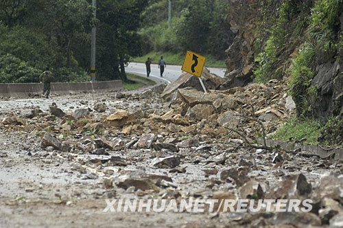 5月24日,在哥倫比亞梅塔省的拉巴爾薩,人們走過地震后布滿落石的公路。
